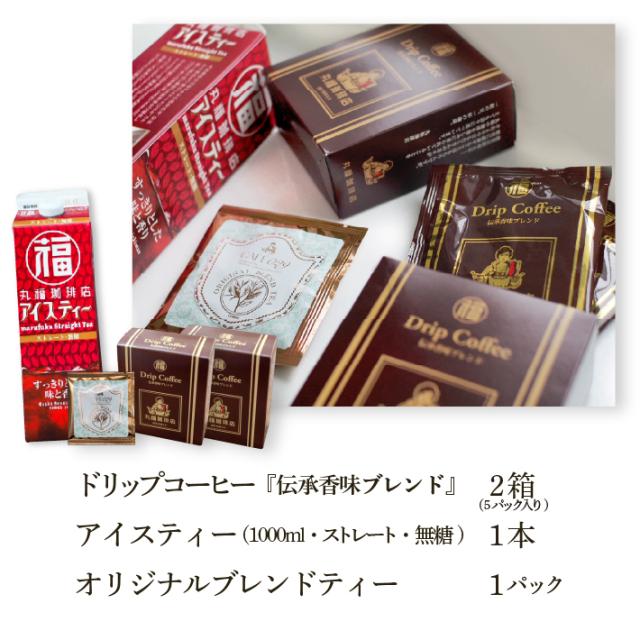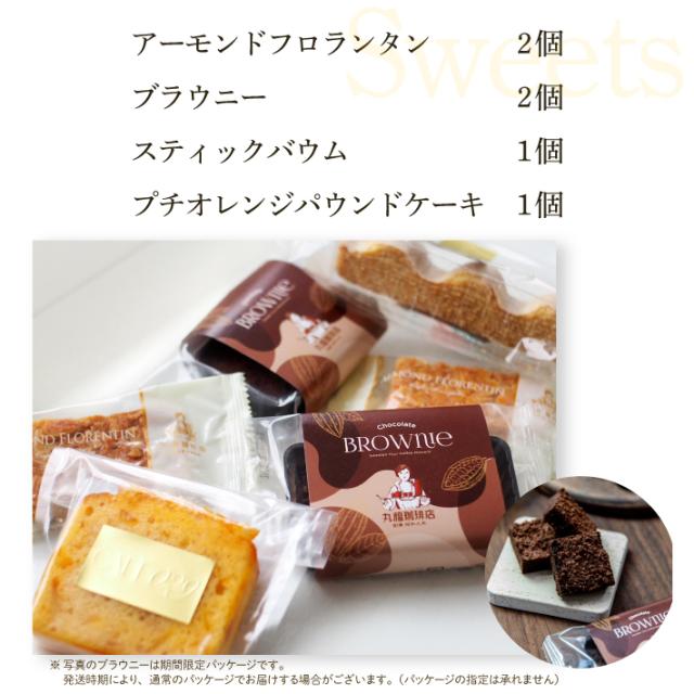 ドリップ珈琲伝承香味ブレンド×2箱 アイスティーストレート無糖×1本 オリジナルブレンドティー×1パック アーモンドフロランタン×2個 ブラウニー×2個 スティックバウム×1個 プチオレンジパウンドケーキ×1個 |