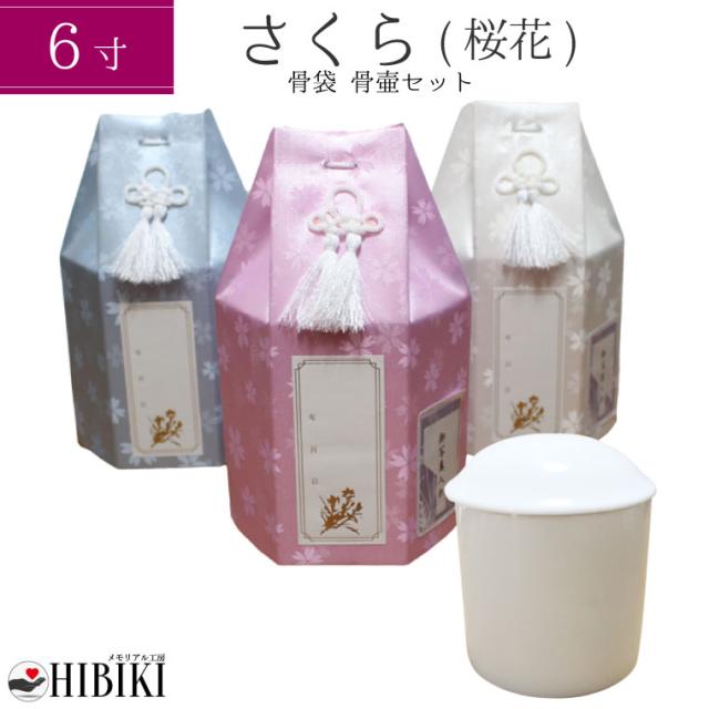 骨壷+骨袋セット さくら 六角 6寸 覆い袋 骨壷カバー 白並 骨壺 戒名・お写真シール付