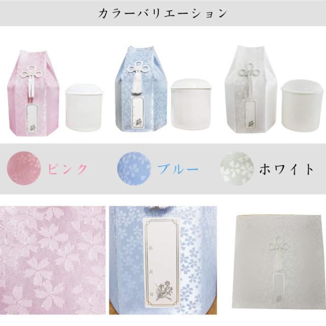 6寸の骨壷と覆い袋(骨壷袋)のセットです。お色はブルー、ピンク、ホワイトの小桜模様。