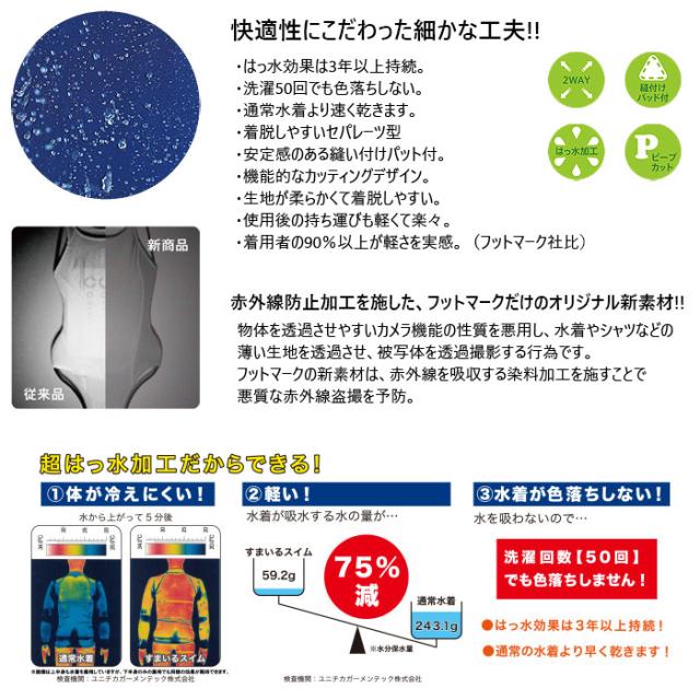 物体を透過させやすいカメラ機能の性質を悪用し、水着やシャツなどの薄い生地を透過させ、被写体を透過撮影する行為です。フットマークの新素材は、赤外線を吸収する染料加工を施すことで悪質な赤外線盗撮を予防。