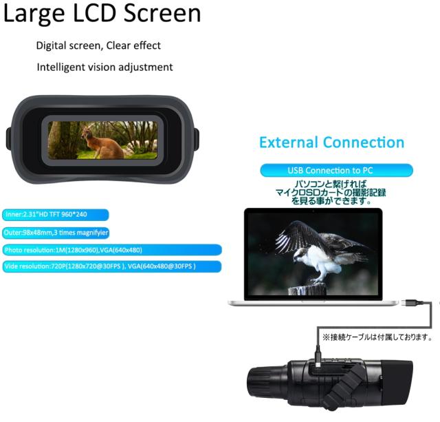 大型HD TFT液晶画面なので普通の双眼鏡のように覗き込む必要はありません。