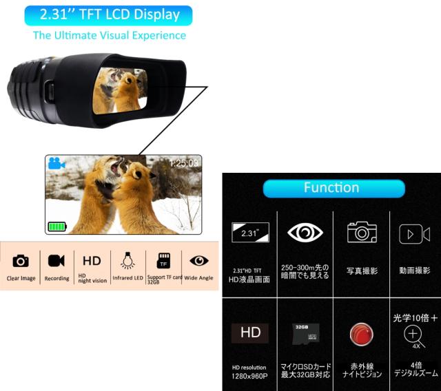 【送料・税込み】正規品 TB-NV80 960P 高画質 暗視 カメラ 付き ナイトビジョン 双眼鏡 バージョン 赤外線 望遠鏡 カメラ スコープ binoculars 液晶 画面 マイクロSDカード sd 録画 写真 記録 証拠 アウトドア バード ウォッチ 防犯 監視 暗闇 夜 見える デジタル ランキング