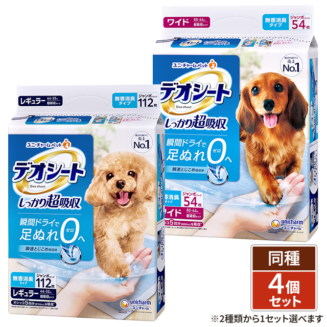 [2種類から1セット選択]ペットシーツ デオシート しっかり 超吸収 無香消臭タイプ レギュラー112枚入り×4袋入 ワイド54枚入り×4袋入 ユニ・チャーム ペット 大容量 まとめ買い 超吸収 無香 消臭