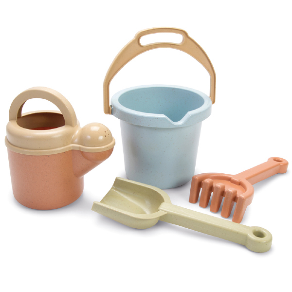砂遊びや水遊びに大活躍するバケツ・スコップ・くまで・ジョーロの4点セット。
