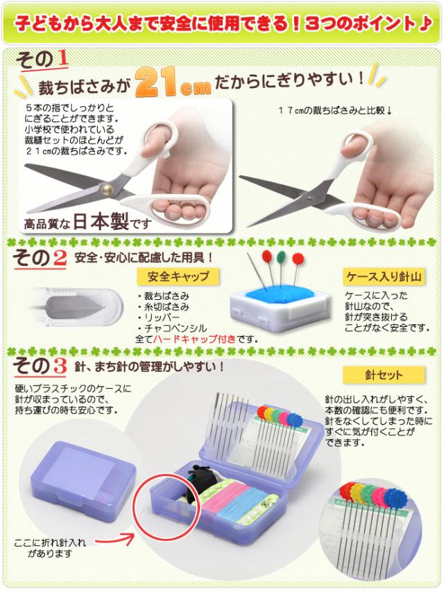 ◆キャップ付の糸きりばさみ、プラスチックケース入りの針山など安全面を考慮しております。