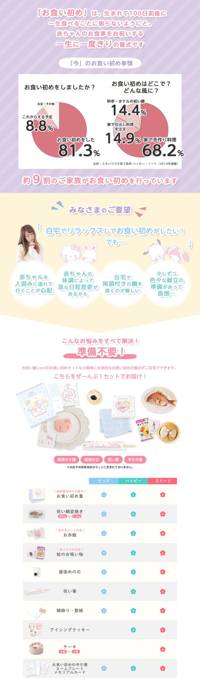 サンリオキャラクターズベイビーズ(キティちゃん、マイメロディ、ポチャッコ)などの人気キャラクターが集合。儀式の後もず~っと長く使えるお重箱付き♪儀式の手順を解説した手引書も付き。