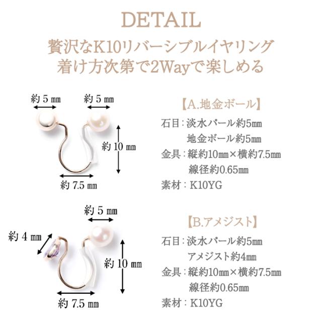 【地金ボール×淡水パール】地金ボールと淡水パールを使用した上質なイヤリングです。着け方次第で2Wayで楽しめる贅沢なK10リバーシブルデザインは、普段使いのカジュアルスタイルから結婚式などのパーティーシーンまで幅広くお使い頂けます。大切な方への贈り物としても最適です。ニッケルフリーの10金素材なので、金属アレルギーの方でも安心してお使い頂けます。(アレルギーには個人差がございますので、全ての方に適合するものではございません。)【素材・商品サイズ】淡水パール 5mm×地金ボール 5mm イヤリング金具:縦約10mm×横約7.5mm 線径約0.6mm カラー:K10YG(10金イエローゴールド)【2WAYスタイルで使いまわせる】両サイドに天然石と淡水パールがそれぞれついているので、どちらを正面にしても使用できるリバーシブルタイプ。痛くない・落ちにくい、イヤリング/イヤーカフです。U字型のパーツの隙間は約3mmですが、バネ性があるので耳たぶの厚みに問わず、装着可能です。ホワイトデー・誕生日に、またバレンタインのお返し・ホワイトデー・出産祝い・母の日のプレゼント・お嬢様への卒業式や入学式のお祝いなどでも人気の商品です。