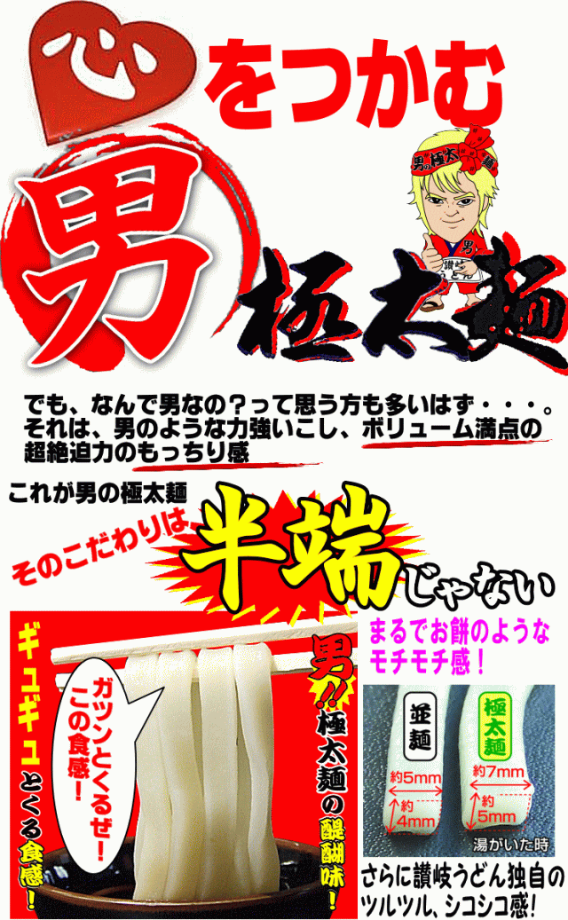 ■半生完熟讃岐うどん・極太麺■原材料名:小麦粉(国内製造)、食塩/加工澱粉、酒精■内容量:1袋(250g)×3袋(最大8人前)