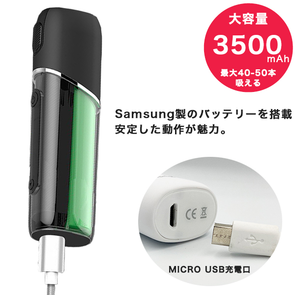 【快速加熱 5秒】5秒で吸い始められる 吸えるまでの時間が早い。 【バッテリー3500mAh】 大容量バッテリー3500mAh 連続吸い40-50本 ※250℃180秒設定の場合 ※吸い方により異なります。 【温度設定】250℃〜320℃の15段階設定。温度の設定によって味が変わる。お好みの温度を見つけられる 【ディスプレイ】喫煙時間、喫煙本数、喫煙温度、バッテリー残量、その他設定がディスプレイで確認できる。 【喫煙時間設定】180秒〜270秒の間で5秒間隔で設定可能。 【セラミック加熱棒】加熱棒はセラミックを採用。耐久性に優れています。 【バイブレーション機能付き】点熱、喫煙可能状態、喫煙終了をバイブレーションでお知らせ。 【タイマー機能】あと何秒吸えるかがディスプレイにカウントダウン式に表示。 【お掃除機能搭載】お手入れらくらく高温で雑味の元を消去。お掃除機能を使っていれば面倒な掃除棒などを使っての掃除はたまにでOK♪ 【喫煙本数カウンター】何本吸ったか一目で分かるカウンター付き!リセットも簡単にできます。吸い過ぎ防止や今日は何本まで吸うなどの目安に最適♪ 【バッテリーレベル表示】常にディスプレーにバッテリー残が表示。 【マイクロUSB充電】 USBを繋ぐだけの簡単充電。 【スライド式ホルダー】ホコリなどの侵入を防ぎます。 【タール浸透防止機能】タールが浸透しにくい構造でクリーンにスモーキング。 【充電方法】マイクロUSBケーブル 生産国:中国 サイズ:約 H10.1 x W3.7 xD2.5 cm 重量:約 89g 容量:3500mAh 素材:高温耐性プラスチック 入力電圧:5V 出力電圧:3.7V 加熱喫煙時間:デフォルト210秒、調整可能範囲180-270秒 機能:低電圧保護、過充電保護、ショート保護 セット内容:本体、ユーザーマニュアル(日本語) 充電用USBケーブル、清掃用綿棒、品質証明書 |