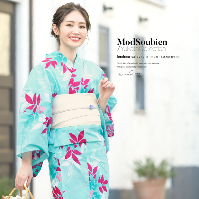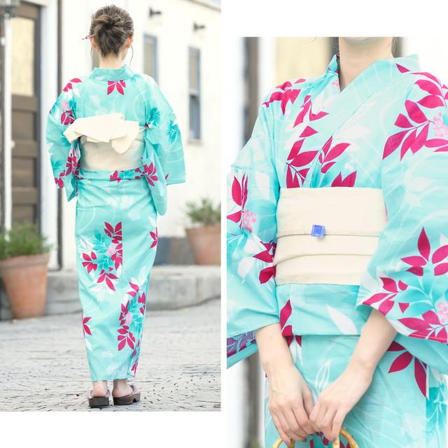 浴衣セット レディース 浴衣セット 作り帯 大人 2点セット(浴衣/帯) 青緑 ターコイズグリーン ピンク 白 南天 流水 金魚 綿 紅梅織 夏 花火大会 ボヌールセゾン フリー