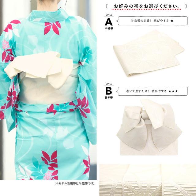 帯は、体に巻いて後ろで結ぶタイプの半幅帯、または作り帯からお選びいただけます。モデル着用は半幅帯です。