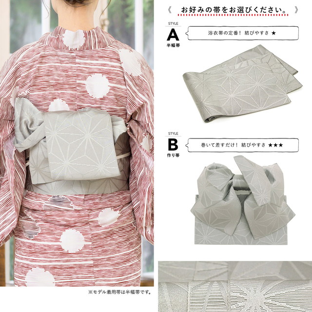 帯は、体に巻いて後ろで結ぶタイプの半幅帯、または作り帯からお選びいただけます。モデル着用は半幅帯です。