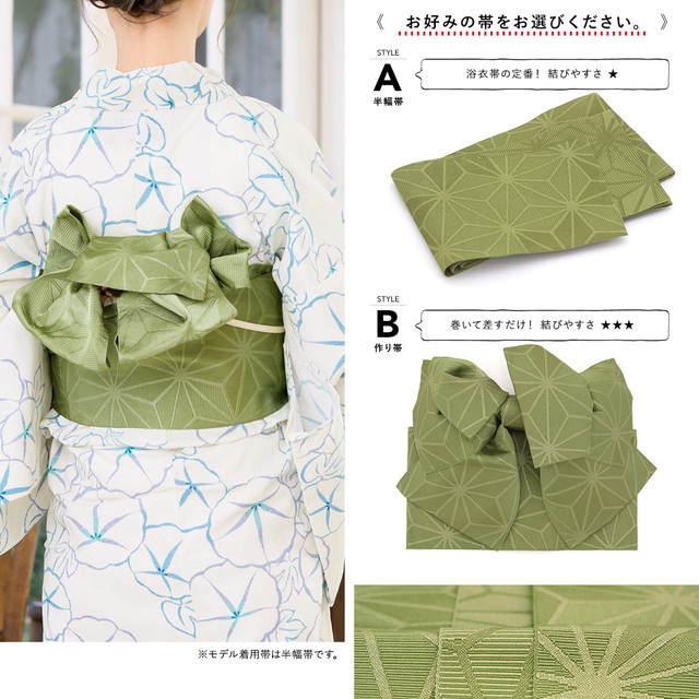 帯は、体に巻いて後ろで結ぶタイプの半幅帯、または作り帯からお選びいただけます。モデル着用は半幅帯です。