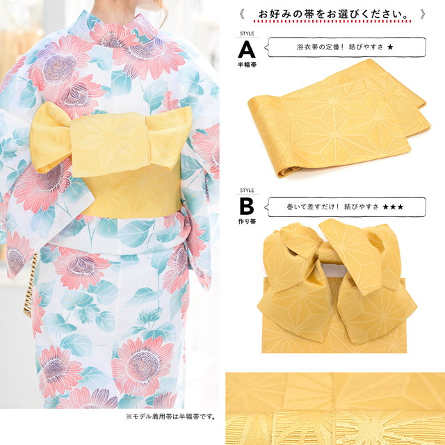 帯は、体に巻いて後ろで結ぶタイプの半幅帯、または作り帯からお選びいただけます。モデル着用は半幅帯です。