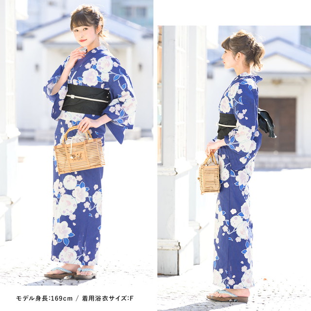 浴衣セット レディース 浴衣セット 作り帯 大人 2点セット(浴衣/帯) 紺青 ネイビーブルー 白 黒 椿 雪輪 金魚 綿 縞 ラメ 夏 花火大会 ボヌールセゾン フリー
