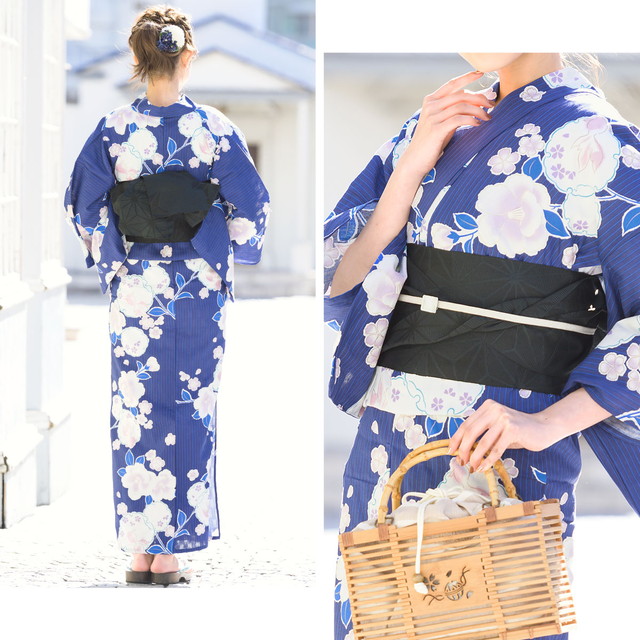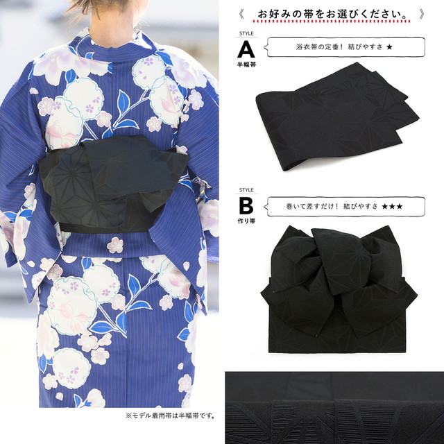 帯は、体に巻いて後ろで結ぶタイプの半幅帯、または作り帯からお選びいただけます。モデル着用は半幅帯です。