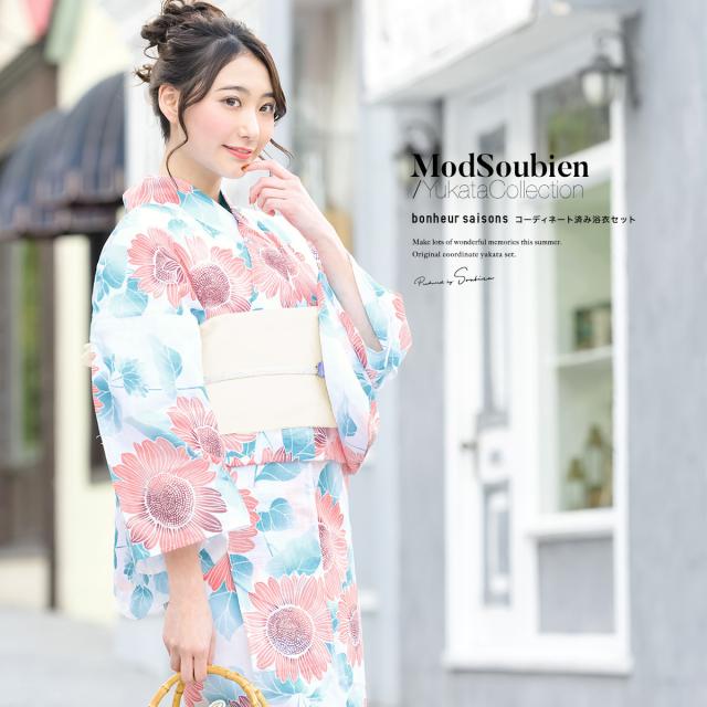 浴衣セット レディース 浴衣セット 作り帯 大人 2点セット(浴衣/帯) 水色 ブルー 薄黄色 クリーム 向日葵 花 ラメ 綿 夏 花火大会 ボヌールセゾン フリー