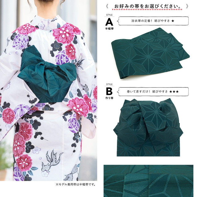 帯は、体に巻いて後ろで結ぶタイプの半幅帯、または作り帯からお選びいただけます。モデル着用は半幅帯です。