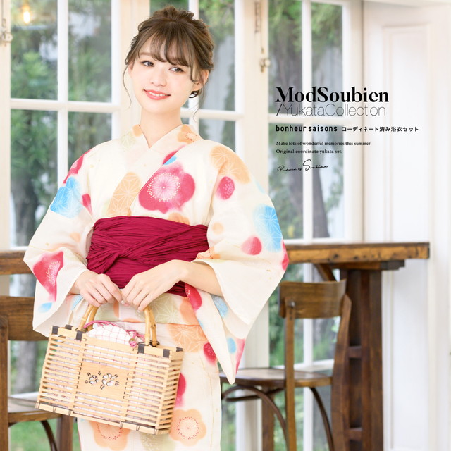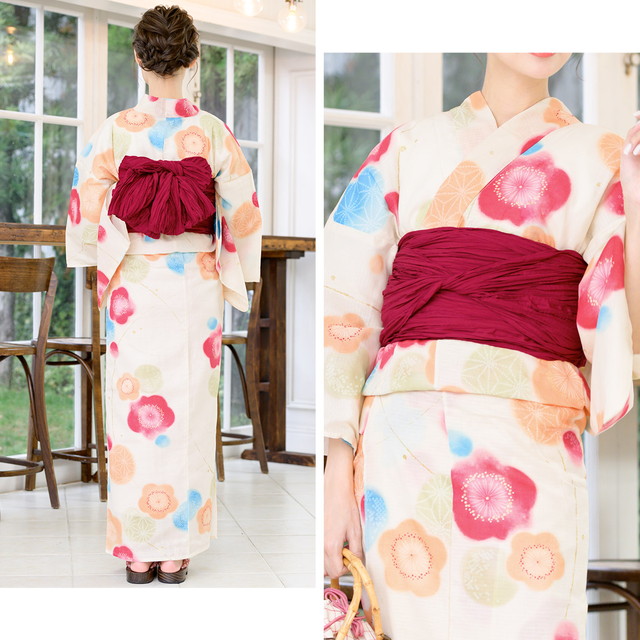 浴衣セット レディース 浴衣セット 兵児帯 大人 2点セット(浴衣/帯) アイボリー カラフル 赤 ぼかし 梅 鹿の子 麻の葉 ラメ 綿 夏 花火大会 ボヌールセゾン フリー