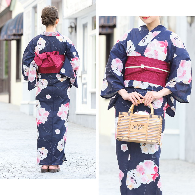 浴衣セット レディース 浴衣セット 作り帯 大人 2点セット(浴衣/帯) 濃紺色 ネイビー 白 ピンク 赤紫 雪輪 梅 花 金魚 綿 紅梅織り 夏 花火大会 ボヌールセゾン フリー