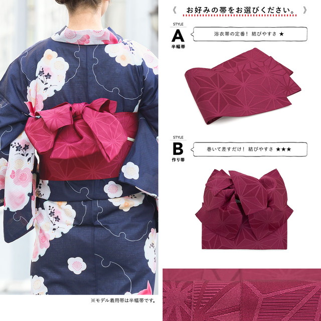 帯は、体に巻いて後ろで結ぶタイプの半幅帯、または作り帯からお選びいただけます。モデル着用は半幅帯です。