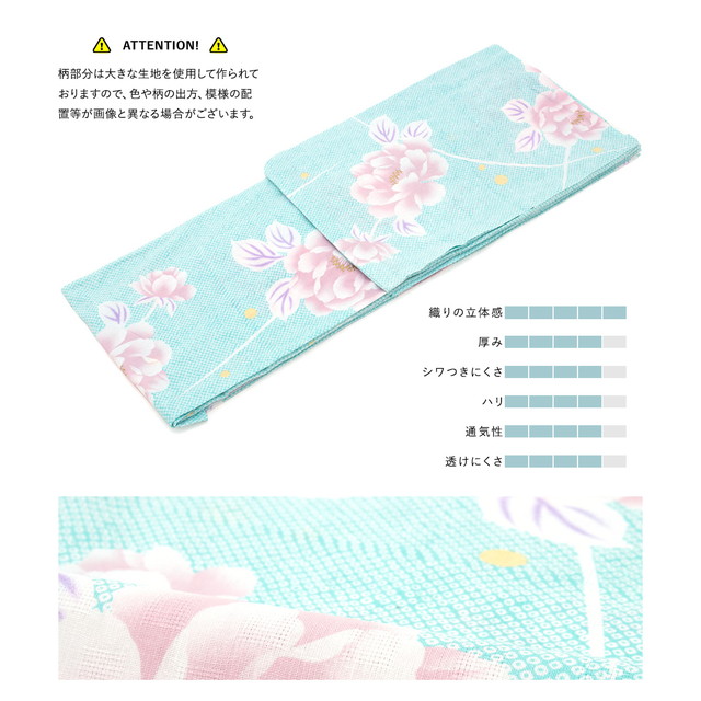 浴衣セット レディース 浴衣セット 作り帯 大人 2点セット(浴衣/帯) 水色 ライトブルー ピンク クリーム 牡丹 花 露芝 ラメ 手捺染 手縫い 綿麻 夏 花火大会 ボヌールセゾン フリー