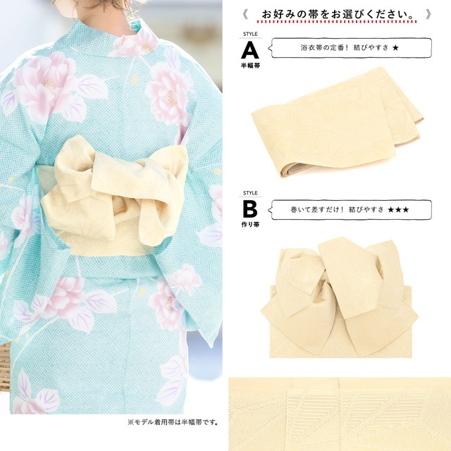 帯は、体に巻いて後ろで結ぶタイプの半幅帯、または作り帯からお選びいただけます。モデル着用は半幅帯です。
