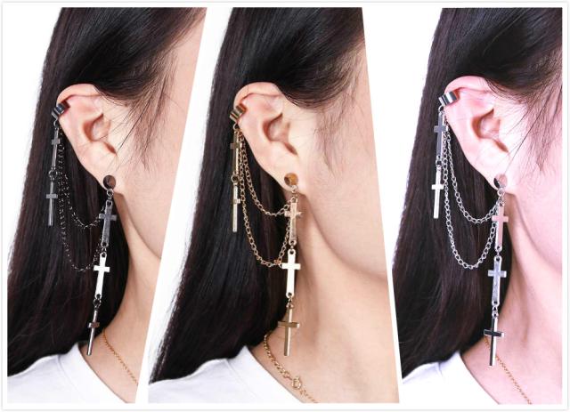 片耳用 チェーン 十字架 ピアス ★ イヤー カフ クロス ピアス ジュエリー メンズ レディース アクセサリ コスプレ 金 銀 黒 B42-26
