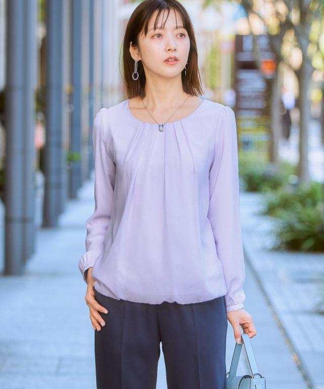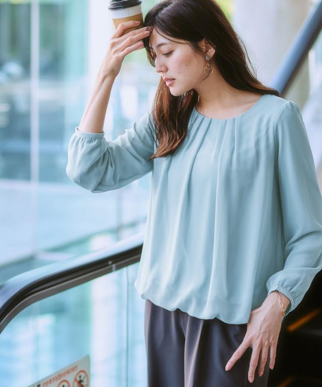コーディネートを選ばないシンプルで控えめなデザインが魅力のブラウス。着るだけでふんわり立体的で優美なシルエットを叶える裾ゴム仕様。ジャケットインにオススメ!な着映えをつくるデザイントップス。