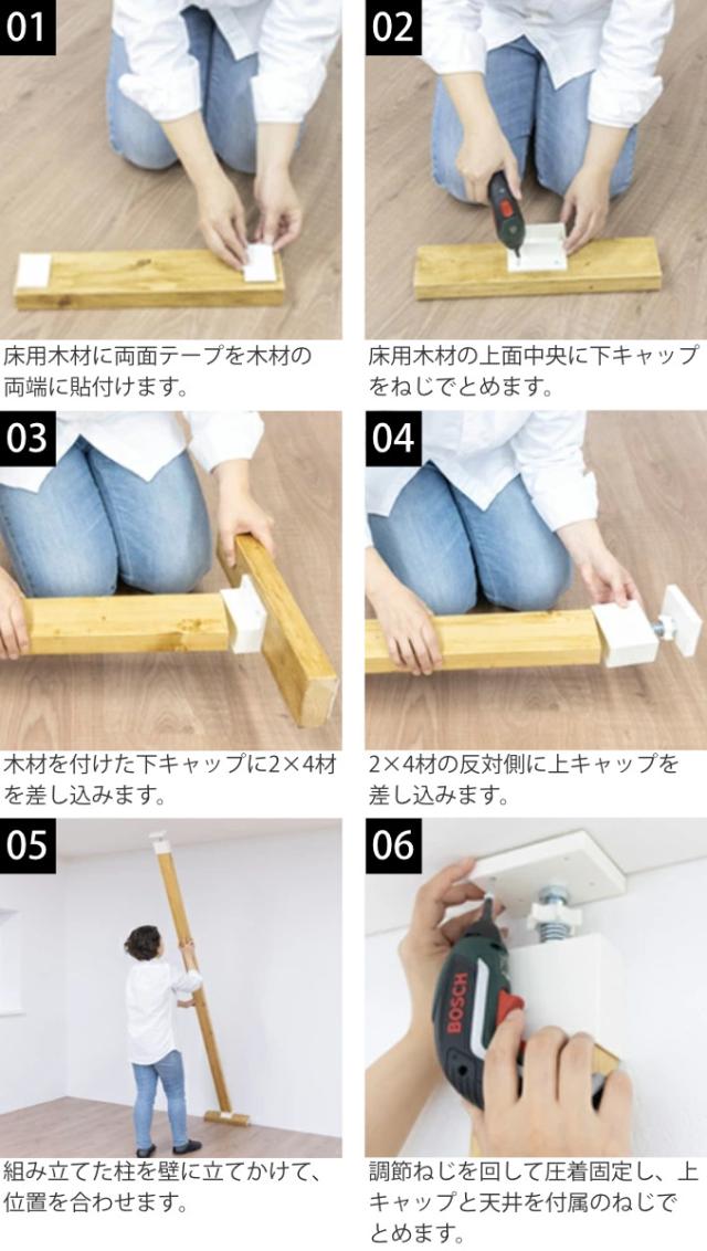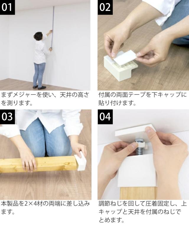 | 注意事項 | ※この商品は屋内専用です。 ※使用する2×4材に反りや曲がりがあると正常に装着できない可能性があります。 ※この商品は縦突っ張り専用です。横向きには使用しないでください。 商品ページ内には別の商品を含む画像を使用しています。 |