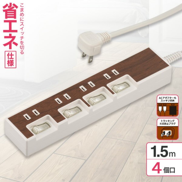 省エネ仕様の節電タップ 4個口 1.5m 木目調ブラウン