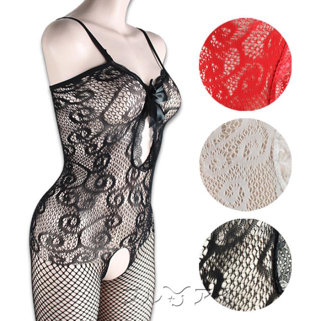 ボディには妖艶な模様、レッグ部分は大きめな網タイツ、フロントは大胆にカットアウトされたセクシーランジェリーです。股部分は穴あきのオープンクロッチでストレッチの効いた肩紐のあるキャミソールタイプになります。