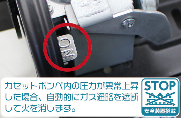 カセットボンベ内の圧力が異常上昇した場合、自動的にガス通路を遮断して火を消す圧力感知安全装置が付いています。