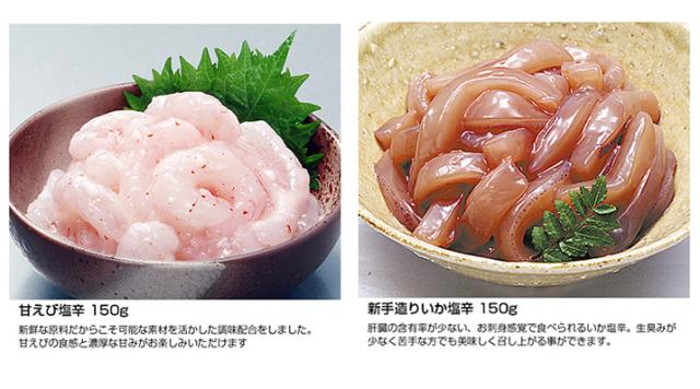 【松前漬】数の子(ドイツ)、しょうゆ(小麦・大豆を含む)、いか加工品、砂糖、昆布、醸造調味料、還元水あめ、食塩、たん白加水分解物、酵母エキス、赤唐辛子、かつお節粉末、かつおエキス / ソルビット、調味料(アミノ酸等)、酒精、増粘多糖類、着色料(黄4、黄5、赤102、赤106) 【小いかのトビらんらん】コウイカ(マレーシア、ベトナム、タイ)、 とび魚卵、昆布、しょうゆ(小麦・大豆を含む)、食塩、米発酵調味料 / ソルビット、調味料(アミノ酸等)、酒精 【甘えび塩辛】甘えび(ロシア産、カナダ産)、発酵調味料、こうじ風調味料、還元水あめ、食塩、砂糖、赤唐辛子,ソルビット、酒精、調味料(アミノ酸)、pH調整剤、増粘多糖類 【新手造りいか塩辛】いか(アルゼンチン)、食塩、いか肝臓、米発酵調味料、魚醤、還元水あめ、酵母エキス、たん白加水分解物(大豆を含む)、砂糖 / ソルビット、調味料(アミノ酸等)、酒精、増粘多糖類、ビタミンB1、着色料(紅麹)、甘味料(甘草、ステビア) |