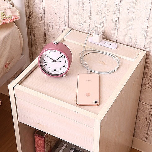 ソファやベッドの横に便利なアイテム。ソファやベッドのサイドなど様々な場所で活躍します。コンパクトなサイズなので省スペースで設置可能です。コンセント2口付きでスマホの充電などもできます。