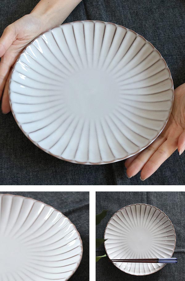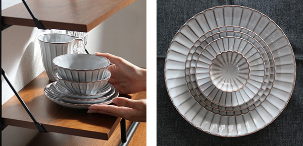 器の表面を削って凹凸をつける技法を 「しのぎ」と言います。しのぎをすることで、釉薬の濃淡がストライプに出るのが味わい深く、盛り付けた料理を引き立てます。また、結婚式や銀婚式などのお祝い事や敬老の日の贈り物におすすめです。