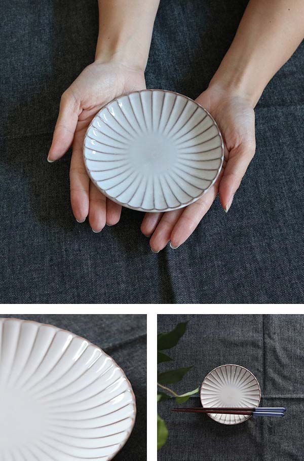 器の表面を削って凹凸をつける技法を 「しのぎ」と言います。しのぎをすることで、釉薬の濃淡がストライプに出るのが味わい深く、盛り付けた料理を引き立てます。また、結婚式や銀婚式などのお祝い事や敬老の日の贈り物におすすめです。
