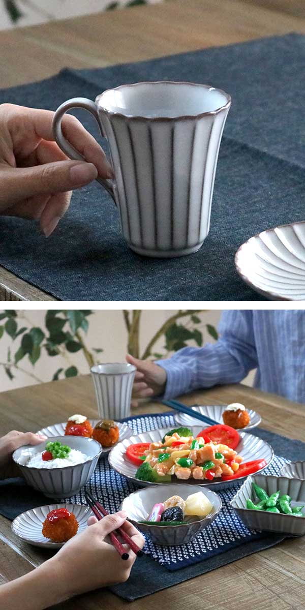 器の表面を削って凹凸をつける技法を 「しのぎ」と言います。しのぎをすることで、釉薬の濃淡がストライプに出るのが味わい深く、お茶の美味しさを引き立てます。また、結婚式や銀婚式などのお祝い事や敬老の日の贈り物におすすめです。