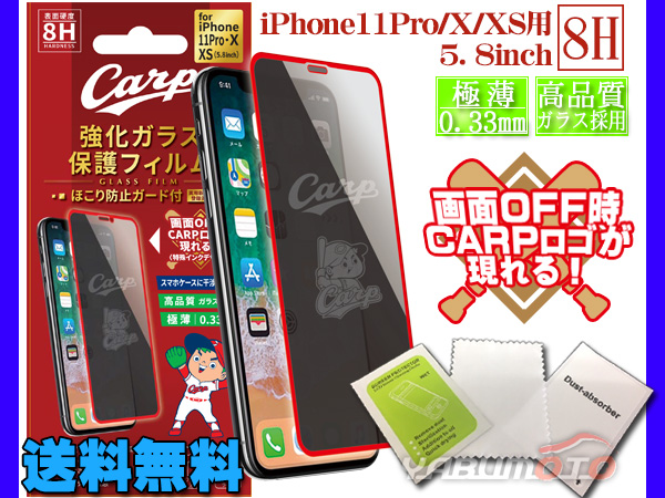 カープ公認デザイン 強化ガラス 保護フィルム iPhone11Pro X XS 5.8インチ 8H 極薄 高品質 ほこり防止ガード付 メール便 送料無料