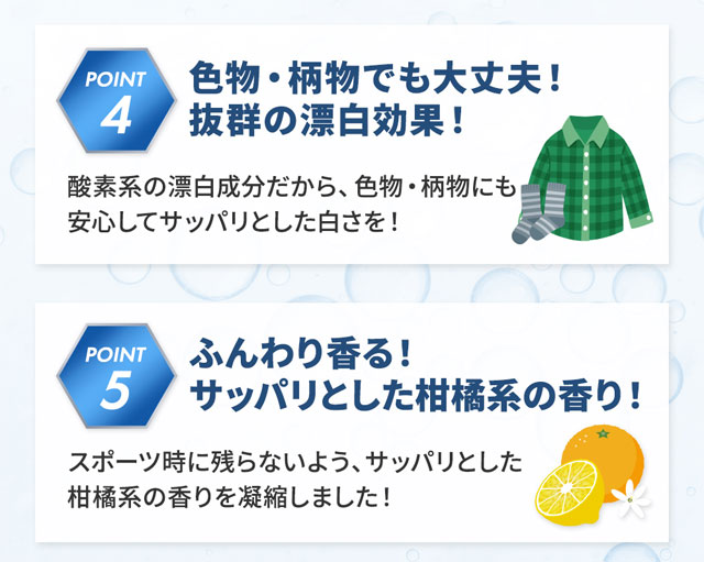 酸素系の漂白成分だから、色物・柄物にも安心してサッパリとした白さを!