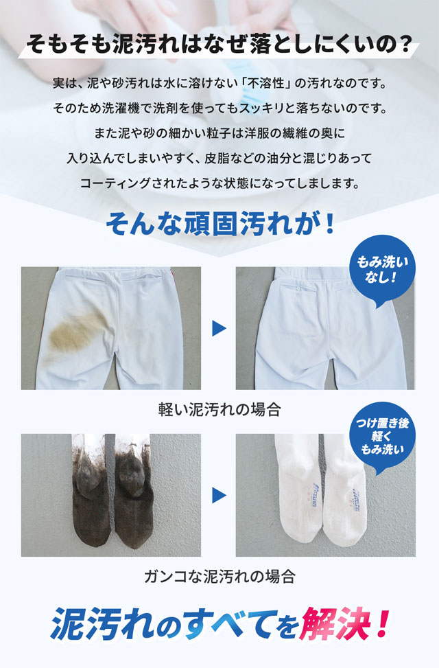 土・泥のガンコな汚れを落とす為の洗浄成分を超高配合!