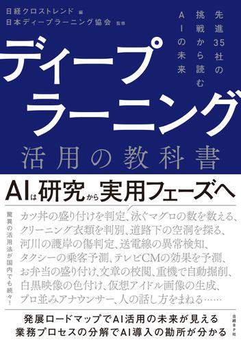 インターネットに遅れること20年、ディープラーニングは、「汎用目的技術」の1つとして、あらゆる産業を変えていくとみられています。汎用目的技術とは、古くは動物の家畜化、車輪、印刷の発明から、鉄道、電気、自動車、インターネットまで「原理は単純で汎用的でさまざまなことに利用できる」技術のことをいいます。本書は、ディープラーニングが与えるインパクトを事例を基に解説します。第1章では、東京大学大学院工学系研究科 特任准教授の松尾豊氏が描く「ディープラーニングをベースにしたAIの技術的発展」(ロードマップ)を解説。第2〜5章ではこのロードマップを基に国内の先進事例を分類して紹介していきます。カツ丼の盛り付けを判定、泳ぐマグロの数を数える、クリーニング衣類を判別、文章の校閲、河川の護岸の傷判定、送電線の異常検知、道路下の空洞を探る、タクシーの乗客数予測、テレビCMの効果を予測、お弁当の盛り付け、重機で自動掘削、白黒映像の色付け、仮想アイドル画像の生成、プロ並みアナウンサー、人の話し方をまねる・・・・・・続々登場する、こうしたディープラーニングの驚異の活用法が分かります。