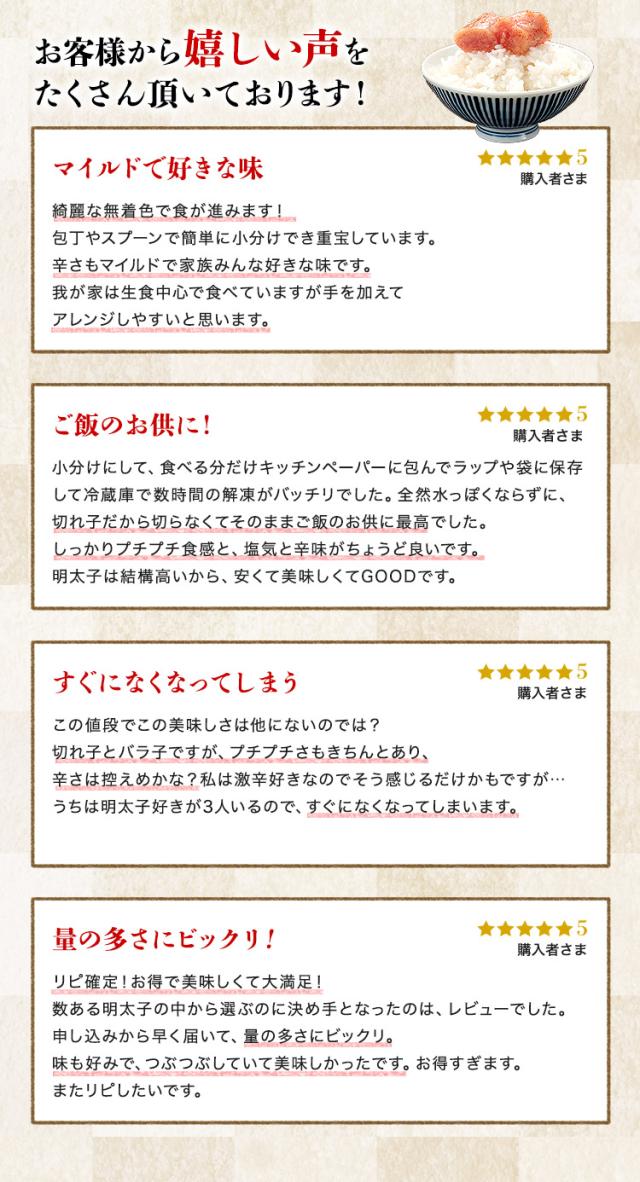 - 商品が無くなりかけたので探していたら、お安くお得に買えました。 明太子の量が多い時はラップ等で囲って冷凍に、少しずつ解凍して食べています。