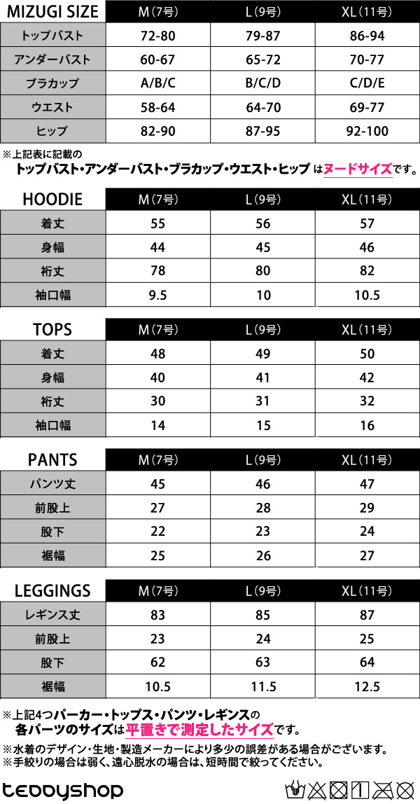 ●上記4つパーカー・トップス・パンツ・レギンスの各パーツのサイズは平置きで測定したサイズです。