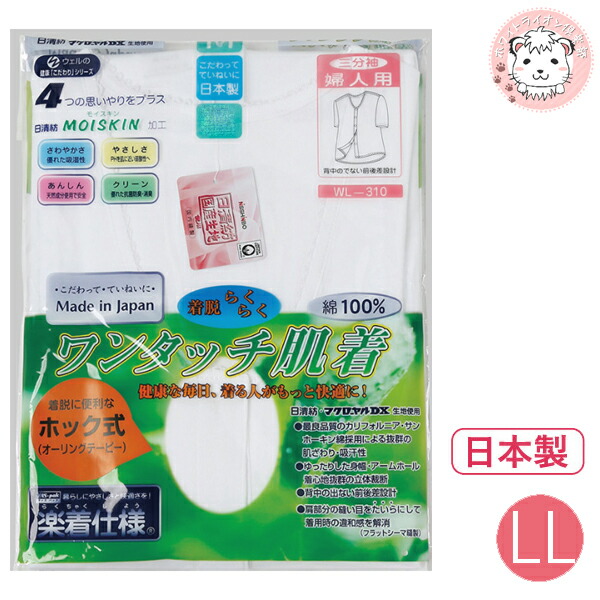 3分袖 前開きシャツ ワンタッチ肌着 ホック式 抗菌防臭 消臭 綿100% 日本製 LL | フライス レディース 婦人 綿 介護インナー 半袖 インナーシャツ 下着