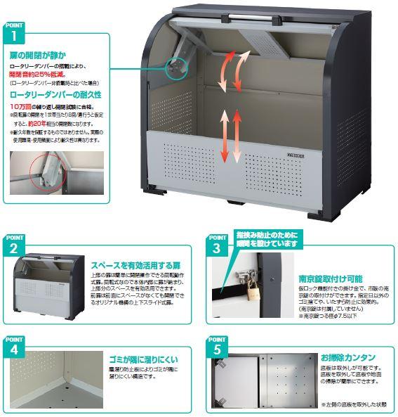 スチールタイプ 耐久性に優れたスチール製。 耐久性に優れた高耐食溶融めっき鋼板製。 扉は使いやすさと安全性を考慮した設計。 ● デッドスペースが少なく、誰でも操作がしやすい回転式上扉。 ● 高耐久のロータリーダンパーを標準装備。(左右1個ずつ)。 ● 内側からレベル調整が可能。 ● 世帯数の少ない集合住宅や店舗などに最適。 ポイント1 扉の開閉が静か ロータリーダンパーの搭載により、 開閉音約25%低減。 (ロータリーダンパー非搭載時と比べた場合) ロータリーダンパーの耐久性 10万回の繰り返し開閉試験に合格。 ※回転扉の開閉を1世帯当たり8回/週行うと仮定すると約20年相当の開閉数になります。 ※耐久年数を保証するものではありません。実際の使用環境・使用頻度により耐久性は異なります。 ポイント2 スペースを有効活用する扉 上部の扉は簡単に開閉操作できる回転動作式扉。回転式なので本体内部に扉が納まり、上部分のスペースを有効活用できます。 前扉は前面にスペースがなくても開閉できるオリジナル機構の上下スライド式扉。 ポイント3 南京錠取付け可能 仮ロック機能付きの掛け金で、市販の南京錠の取付ができます。指定日以外のゴミ捨てや、いたずら防止に効果的。 (南京錠は付属していません) ※南京錠つる径7.5以下 ポイント4 ゴミが隅に溜りにくい 塵溜り防止板によりゴミが隅に溜りにくい構造です。 ポイント5 お掃除カンタン 底板は取外しが可能です。 底板を取外して底板や地面の掃除が簡単にできます。 ※左側の底板を取外した状態 注意 転倒防止のため、所定のアンカー工事等を必ず行ってください。 倒壊または破損の原因となります。(アンカーボルト付属) ※45Lゴミ袋の集積数は容量換算で算出した目安のため、実際の集積数と異なる場合があります。 ※世帯数は集積可能容量/ファミリー1世帯当たり45Lゴミ袋2袋で算出した目安です。 組立式 世帯数の目安約6世帯 ゴミ袋45L集積目安約13袋 容量600L 本体質量49kg 材質スチール サイズH1160×W1000×D750mm 品番【 CKR-1007-2型 】 ※画像はイメージです。 ※パッケージ、仕様、品番などの変更が予告なく変更される場合が御座います。 |