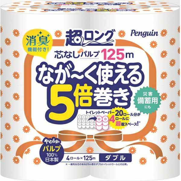 ペンギン芯なし超ロング(パルプ)125m4Rダブル 2606 白 丸富製紙 トイレットペーパー 長持ち 防災 備蓄 2枚重ね