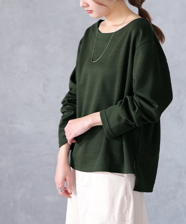 - トレーナーほど厚くなくTシャツより厚い…その通りです。襟の開きも、長目の袖も私は好きです。裏起毛が嫌いな私でも大丈夫。寒くなったら、きっと活躍すると思います。