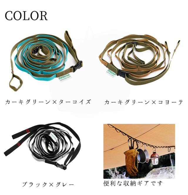 実用的でスタイリッシュなギアを多数発信する「Peregrine Design(ペレグリンデザイン)」より、ウェービングテープで作ったハンギングチェーンのご紹介です。アウトドアで収納スペースを確保するのは至難の業。そんな時は、即席で干し場を作れるハンギングチェーンがおすすめ!プラスチックのアタッチメント(バックル)が両端に付いているので、ループ部と本体をカチッと連結させることで、テントやタープ、車内など様々な場所にフィットさせて「吊るす収納」を作ることができます。濡れた服や手袋などを干したり、洗った食器を乾燥させたり、またカラビナがあれば買ってきた食材をビニール袋のままちょっと引掛けて置いたりと、その使い方は無限大。LEDランタンなどのライトを、吊るしながら照らせば、広範囲に光を行き届かせることができます※。目で見てすぐに何が掛けてあるか分かるので、なにかとかさばるキャンプでも大切なギアの紛失予防ができてgood!旗やオーナメントを飾り付ければ、キャンプサイトの雰囲気がよりラグジュアリーになります。自慢のアウトドアギアを吊るして収納することにより、差がつくキャンプライフを実現。気分もぐっと盛り上がります!カラーは、アウトドアシーンにマッチする「カーキグリーン×コヨーテ」、爽やかな配色の「カーキグリーン×ターコイズ」、シンプルかつクールに決まる「ブラック×グレー」の3色をご用意。スタイルやお好みに合わせてチョイスいただけます!
