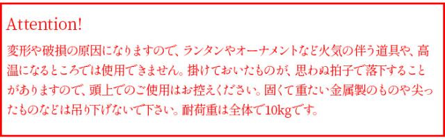 | プラスチックのアタッチメントは、カチッと音がして、きちんと奥まで留まっていることを確かめてからお使いください。 全体での耐荷重は10kgを想定しています。それ以上の荷重のものは付けたり掛けたりしないでください。 木の枝やポールなど、支えとなる支柱の丈夫さ、安定と安全を十分に確認した上でお使いください。 危険防止のため、お子様だけでのご使用はお控えください。 濡れたままで長時間放置しないでください。破損や変形、変色などの原因になります。 |